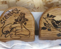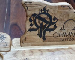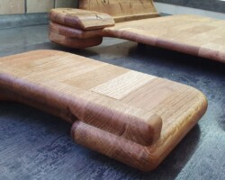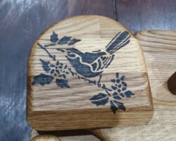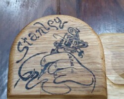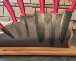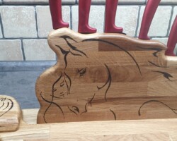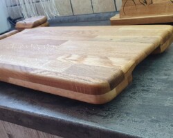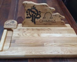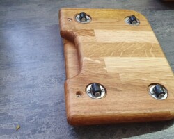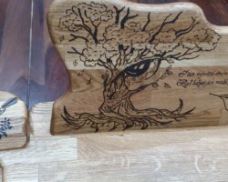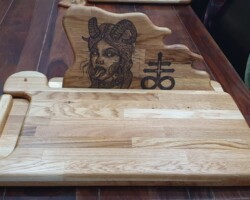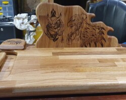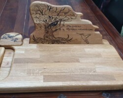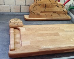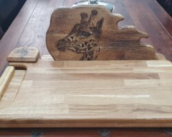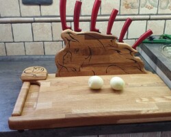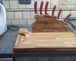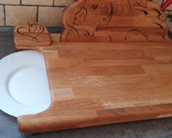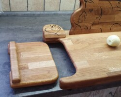 Prkénko je vyrobeno z dubového dřeva tl. 36mm, celkový rozměr je 60 x 40 cm (pracovní řezná plocha je 50×30), ze spodu jsou gumové protiskluzové nožičky, takže celková výška prkýnka je cca 48 mm. Součástí je vozíček, který se zasouvá pod prkýnko a dá se na něj nasypat nakrájené maso či zelenina z kterého pohodlněji nasypete nakrájené potraviny do hrnce, anebo místo něj vložíte pod prkénko talíř. Součástí je také stěrka, kterou po nakrájení vše shrnete na vozíček nebo talíř. Další součástí je držák na více nožů, viz obrázek, materiál dub, nože drží zezadu na nalepené celoplošné magnetické folii. Na tento držák je možno vypálit obrázek dle přání, po předchozí domluvě technikou pyrografie, což je umělecká technika vypalování do dřeva, viz obrázek. Není to žádná nálepka nebo otisk ani laser. Z boku prkénka je vybrání pro lepší úchop.