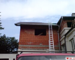Na střeše přístavby staršího RD proběhla montáž plechové krytiny vč. příslušenství (tj. oplechování, okapy, okna, prostupy, nášlapy, sněžníky atp.)