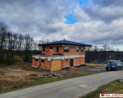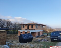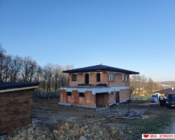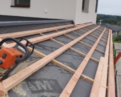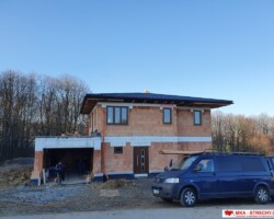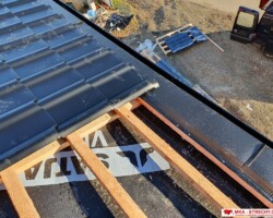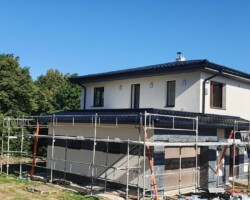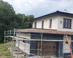 Na novostavbě RD proběhla montáž nové plechové krytiny vč. příslušenství (tj. oplechování, okapy, okna, prostupy, nášlapy, sněžníky atp.)